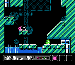 音楽はサンソフト屈指の完成度として名高い。作曲は影山雅司で、カートリッジ側の拡張音源を活用した極めて立体的なサウンドが鳴る。伴奏がしっかり動き、メロディの起伏も大きいのに、効果音と干渉せずに前に出る。軽快に跳ねるリズムが星の反射感とシンクロし、プレイの“手触り”とBGMの“聴こえ”が一致する体験を生んでいるのが印象的だ。視覚・聴覚・操作の三要素が綺麗に連携し、難度は高いのに何度も再挑戦したくなる理由のひとつになっている。グラフィックも小粒ながら丁寧で、敵やギミックが機能を理解しやすいシルエットで描かれ、透明床や滑る斜面といった“性質”が色や模様で読み取りやすく整理されている。