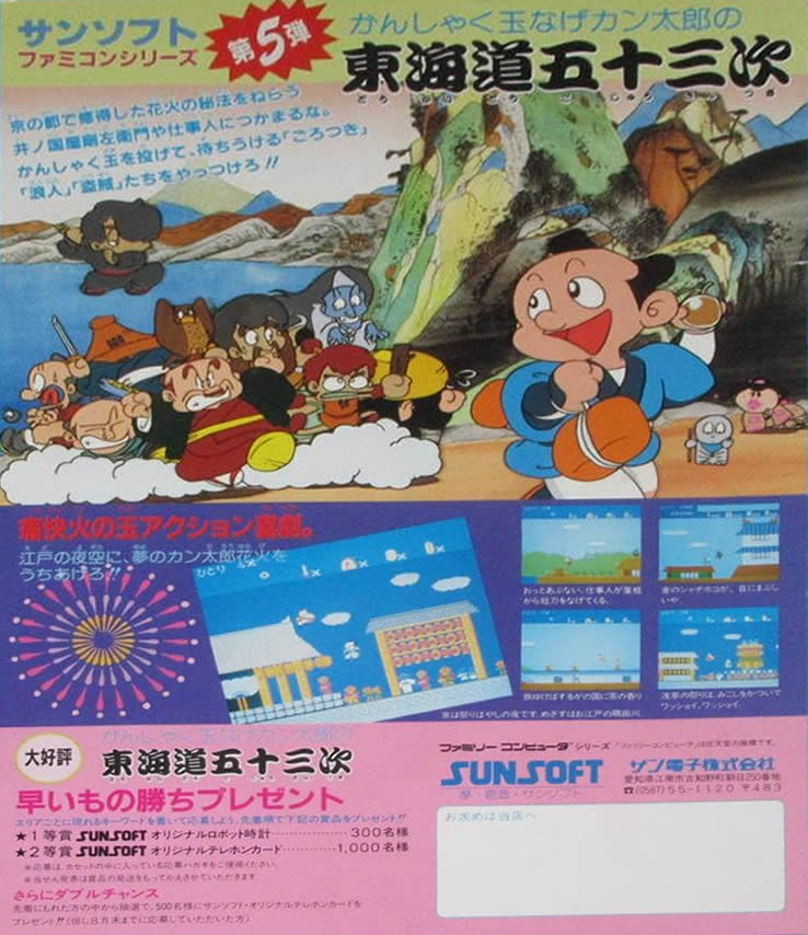 1986年7月3日、サンソフトが4900円で発売したファミコン用『かんしゃく玉なげカン太郎の東海道五十三次』は、京都から江戸へ帰る花火職人カン太郎の徒歩旅を、横スクロールの面構成と生活系のルールで貫いた一本で、53宿場の地理や名所をモチーフにした全ステージを順に踏破しながら、道中で小判を拾い、橋を架け、関所を通り、妨害してくるならず者や狐火や山賊を、投擲するかんしゃく玉と地面設置の爆発でさばいていくという設計になっている。攻撃は空中で当てるだけでなく地面に置いて爆風で倒す相手がいるため、敵の耐性や当たり判定を見極めて一歩手前に投げる、足を止めて設置してから誘う、といった選択が自然と増え、ステージの短い区間ごとに「いつ進むか」を決め直すテンポが生まれる。道具や所持品の扱いは旅の物語と直結しており、通行手形があれば関所役人との衝突を避けられ、なければ小判で通過料を払って先へ進むという現実的な落としどころが用意され、さらに小判は川に簡易の橋を架ける用途にも転用されるため、拾い物の一枚一枚に意味が宿る。遊び心あるパワーアップも旅の比喩と噛み合い、たとえばおにぎりを得ると一時的に無敵で球体化して転がり抜け、下駄を履けば雲上に足場が延びるなど、江戸道中の荒唐無稽さを手触りに落とし込む演出が短い区間にぎゅっと詰められている。